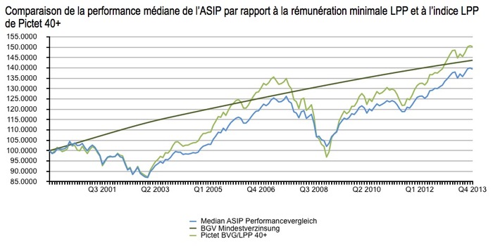 Communiqué de presseComparaison de performance de l'ASIP 2013: réalisation du rendement moyen de +6.2% prévu (IMAGE)2014-01-10T10:00:18Zurich (ots) - Les caisses de pension suisses ont a nouveau enregistré une performance réjouissante au deuxième semestre 2013. Bien que l'élan soit retombé vers la fin de l'année, nombre d'entre elles ont néanmoins pu continuer de raffermir leur situation financière au deuxième semestre. En raison des taux d'intérêt pratiqués, outre les actions, les placements immobiliers ont contribué à ce résultat positif. La part des actions dans le portefeuille a joué un rôle décisif. Dans l'univers de placement, la part en actions suisses varie entre 3% et 20% dans 90% des cas (de 5 à 95%); celle des actions étrangères entre 6% et 42%. Certaines institutions de prévoyance ayant adopté une stratégie plus risquée, avec un portefeuille comportant plus d'actions, présentent même des rendements annuels de plus de 10%. Le résultat annuel de 6,2% obtenu par les institutions affiliées à l'ASIP, conforme aux pronostics, est le troisième meilleur résultat depuis la crise financière de 2008. Cette embellie permet aux caisses de pension de reconstituer leurs réserves et provisions, et de faire profiter leurs assurés de cette excellente performance. Ces résultats positifs montrent que les organes de gestion assument leurs responsabilités avec succès, même dans des périodes difficiles. Malgré ces chiffres excellents, il convient de souligner que les caisses de pension doivent finalement opérer dans des conditions cadres adéquates. Le taux d'intérêt minimal et le taux de conversion doivent être définis de manière compréhensible, transparente et actuariellement correcte. Les réserves de fluctuation de valeur et les provisions doivent en outre être suffisantes. Compte tenu des expériences faites ces dernières années, la constitution de réserves et de provisions reste une priorité. Depuis la première publication de la comparaison de performance de l'ASIP, en juin 2000, les caisses de pensions y participant ont enregistré un rendement moyen annualisé de 2,5%. Cette valeur n'atteint pas la rémunération minimale LPP cumulée entretemps. Grâce aux résultats positifs des deux dernières années, la performance moyenne cumulée a pu se rapprocher de la valeur du taux d'intérêt minimal LPP. Informations relatives à l'étude: L'évaluation de la performance médiane du portefeuille global se base sur l'allocation des actifs des participants au 31 juin 2013, extrapolée à la fin décembre 2013. Pour le deuxième semestre 2013, il en résulte une performance de 3,2%. La pression persistante sur les intérêts a entraîné une surperformance des actions par rapport aux obligations, comme cela avait été le cas au 1er semestre. Au 1er semestre 2013, les actions suisses représentaient en moyenne environ 10% des placements de la fortune, et les actions étrangères environ 21%. La part des obligations était de presque 40% en moyenne. L'évaluation rétrospective de la performance médiane a été réalisée sur la base des données de la comparaison de performance de l'ASIP de juin 2013. Avec une fortune globale d'environ 188 milliards de francs, 62 caisses de pension participantes et plus de 1000 portefeuilles pris en compte, la comparaison de performance proposée par l'ASIP est la plus importante comparaison de performance indépendante de ce genre en Suisse. Elle est établie sur une base semestrielle par la société de conseil Towers Watson pour le compte de l'Association suisse des Institutions de prévoyance (ASIP). Toutes les caisses de pension de Suisse peuvent y participer. Cela leur permet de comparer en toute neutralité le rendement du portefeuille global et celui de mandats similaires de différents prestataires. En tant qu'organisation responsable, l'association faîtière des institutions de prévoyance garantit que la comparaison sert exclusivement les intérêts de ces dernières et n'est pas utilisée à des fins de marketing. Rendements moyens annuels actualisés, basés sur les chiffres fournis par les participants, au 30 juin 2013: 2000: 0.22% 2001: -7.33% 2002: -10.65% 2003: 8.94% 2004: 4.16% 2005: 12.81% 2006: 6.42% 2007: 2.09% 2008: - 15.62% 2009: 11.82% 2010: 3.7% 2011: 0% 2012: 7.9% 2013: 6.2% Pour la comparaison sur 10 ans, le rendement annualisé extrapolé de l'univers de l'ASIP s'élève à 3,7% Contact: ASIP - Association suisse des Institutions de prévoyance Permalink: