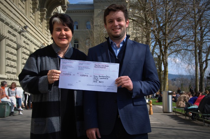 Mais pour se défendre contre cette loi, l'association « Non au 2e tube au Gothard » a lancé avec succès un référendum après que 50 autres organisations s'y soient ralliées. L'association fait donc parvenir la facture pour la récolte de signatures directement à la conseillère fédérale responsable, Madame Doris Leuthard. « De par sa décision, d'adopter le projet du 2e tube sur le plan légal, le Conseil fédéral nous a mis sur le dos cette collecte de signatures. C'est la raison pour laquelle, la facture est envoyée à la chef du Département, Madame la Conseillère fédérale Leuthard, » dit Caroline Beglinger, coprésidente de l'association « Non au 2e tube au Gothard ». Chaque signature coûte environ 1 franc (imprimé, port, certification par les communes, etc...) Et comme nous en avons récoltées 125 573, le montant de la facture correspond aussi à ce chiffre.