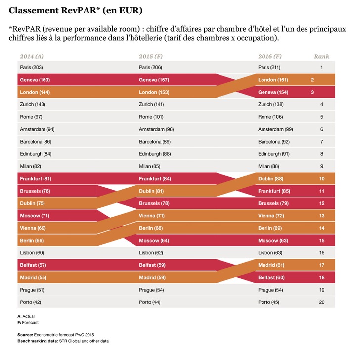 Communiqué de presseLes hôtels suisses en tête du classement international2015-05-07T13:00:02Zürich (ots) - En 2014, l'Europe a attiré plus de touristes par rapport à l'année précédente. En effet, le nombre de nuitées a augmenté de 1,7 %. Les hôtels de Zurich et de Genève se classent toujours dans le top 4 des établissements hôteliers les plus rentables d'Europe, malgré la suppression du taux plancher de l'euro. Ces résultats proviennent de l'étude PwC « Room for growth : European cities hotel forecast for 2015 and 2016 for 20 gateway cities from Amsterdam to Zurich », qui a analysé des hôtels des 20 villes européennes les plus importantes. L'année 2014 a été globalement positive pour le secteur de l'hôtellerie européenne. 600 millions de visiteurs internationaux ont fait grimper le nombre de nuitées. Pour les années 2015 et 2016, l'étude réalisée par PwC s'attend à ce que l'abolition du taux plancher de l'euro se répercutera sur les prix et l'occupation des hôtels en Suisse. Cependant, les hôtels citadins devraient être moins touchés que ceux se situant dans les régions alpines. Les perspectives modestes concernant les statistiques relatives aux prix des chambres et de l'occupation à Genève et à Zurich ne reposent que partiellement sur la suppression du taux plancher. Elles expliquent les attentes légèrement en baisse par les premiers signes d'une suroffre à Zurich et le recul des nuitées de clients russes à Genève. Malgré les conditions de marché en mutation, Genève (236 EUR) et Zurich (196 EUR) se classent aux deuxième, resp. troisième places, juste derrière Paris, en ce qui concerne le prix des chambres moyen. Zurich : Airbnb anime la branche Les hôtels de luxe et de lifestyle, nouveaux ou rénovés, devraient relancer l'offre touristique à Zurich et dans ses environs dans les années à venir. L'offre Airbnb représente actuellement 12 % de toutes les nuitées de Zurich. Le nombre de nuitées Airbnb devrait encore progresser à l'avenir. Les taux d'occupation des autres hôtels zurichois se situent actuellement à un niveau constant, mais ils vont plutôt diminuer sous la pression des nouveaux hôtels. On s'attend à ce que Zurich perdra trois rangs dans le classement du taux d'occupation moyen en Europe, passent de la huitième à la onzième place. Genève : meilleure occupation depuis 2011 Le secteur touristique a continué de progresser à Genève en 2014 et se situe actuellement à son niveau maximal depuis 2011. L'occupation des chambres d'hôtels a augmenté de 3,7 %, tout comme le chiffre d'affaires par chambre. La croissance s'explique par des manifestations telles que les « Fêtes de Genève » et l'augmentation de conférences politiques internationales. Les perspectives économiques pour Genève et pour toute la Suisse sont plutôt mitigées en raison du franc fort. Nicolas Mayer, responsable Tourisme & Hôtellerie chez PwC Suisse, explique à ce sujet : « L'abolition du taux plancher de l'euro va influencer l'hôtellerie suisse. Ce n'est pas l'unique facteur responsable des attentes à la baisse. Il est important que les exploitants trouvent des chemins novateurs permettant de garantir et d'augmenter la loyauté des clients existants, par exemple par une utilisation professionnelle et durable des médiaux sociaux. Les hôteliers qui relèveront avec succès ce défi, seront moins dépendants des canaux de distribution externes et onéreux et pourront reconquérir une partie de la chaîne de création de valeur. » Contact: Nicolas Mayer Permalink: