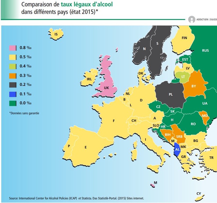 Communiqué de presseAddiction Suisse Taux d'alcool en Europe: mieux vaut vérifier2015-07-02T10:00:05Lausanne (ots) - La période estivale est celle des voyages, y compris sur les routes. Les automobilistes et motocyclistes doivent connaître les limites d'alcoolémie applicables dans les différents pays visités. Addiction Suisse en présente ici une liste actualisée. Reste que, pour ne prendre aucun risque, il suffit de renoncer totalement à l'alcool avant de prendre la route. Les pays européens appliquent sur leurs routes une limite de 0,5 pour mille ou moins. Seule la Grande-Bretagne et Malte tolèrent encore 0,8 pour mille. Des changements récents sont observés en Europe de l'Est. Ainsi, la Serbie est-elle passée cette année de 0,5 à 0,3 pour mille, l'Albanie de 0,0 à 0,1 et la Moldavie de 0,0 à 0,3 pour mille. Dans plusieurs pays de l'Europe de l'Est, comme en Hongrie, Croatie, République Tchèque ou en Roumanie, c'est la tolérance zéro qui prévaut. La limite de 0,5 pour mille est appliquée en Suisse et dans les pays voisins, mais aussi au Portugal, en Espagne ou en Grèce. La Suède, la Norvège et la Pologne ont quant à elles une limite de 0,2 pour mille. Manque de connaissance des limites autorisées Selon le bpa - Bureau de prévention des accidents, seuls 69% de tous les automobilistes interrogés en 2014 connaissaient la limite d'alcool dans le sang de 0,5 pour mille. Lors de l'introduction de cette limite il y a dix ans, ils étaient 92% à le savoir. Les nouveaux conducteurs actuels connaissant mieux la limite générale de 0,5 pour mille que les autres usagers de la route : 83% la connaissent ; chez les moins de 30 ans ayant un permis de conduire à l'essai, ils sont même 96%. Ces derniers sont toutefois soumis à des règles plus strictes durant les trois années de probation. Depuis début 2014, les nouveaux conducteurs, quel que soit leur âge, ne peuvent conduire que s'ils n'ont pas bu d'alcool du tout. L'alcool réduit les capacités, déjà avec de petites quantités A partir de 0,5 pour mille, il n'est plus autorisé de conduire. Mais des risquent existent avec de plus petites quantités. L'attention est déjà réduite à 0,2 pour mille. C'est pourquoi Addiction Suisse conseille de ne pas conduire après avoir consommé de l'alcool. A partir de 0,5 pour mille, il n'est plus possible de réagir rapidement et de manière adéquate dans des situations critiques. A partir d'environ 1 pour mille, toute situation devient risquée. Très vite trop Il est difficile d'estimer son propre taux d'alcool, ce d'autant plus que la même quantité d'alcool ne produit pas la même concentration d'alcool dans le sang chez tout le monde. Le sexe, l'âge ou la prise d'aliments jouent un rôle. On peut très vite dépasser la limite. Pour exemple, une femme de 60 kg buvant sans manger 2 dl de vin (soit 2 verres) aura déjà un taux d'alcool dans le sang de 0,6 pour mille. Infos et liens: * La carte de l'Europe avec les limites de taux d'alcool est disponible sur www.addictionsuisse.ch. dans la rubrique "Faits et Chiffres" http://www.addictionsuisse.ch/faits-et-chiffres/alcool/circulation-routiere/taux-legaux-dalcool/ * Pour répondre à la question des quantités limite dans la circulation routière, Addiction Suisse met la brochure suivante à disposition: Apéro et alcool. http://shop.addictionsuisse.ch/download/c288b6ceed3e3572e4f9549fc10976e641c613d6.pdf * www.alcooldanslecorps.ch La Fondation Addiction Suisse est un centre de compétences national dans le domaine des addictions. Elle est active dans la recherche, conçoit des projets de prévention et s'engage pour un politique de santé. Le but de la fondation est de prévenir ou d'atténuer les problèmes issus de la consommation d'alcool et d'autres substances psychoactives ou liés au jeux de hasard et à l'usage de l'internet. Plus de 200'000 personnes soutiennent notre ONG. Plus d'informations sur notre site internet www.addictionsuisse.ch Vous trouverez le présent communiqué de presse sur : www.addictionsuisse.ch/fr/actualites/communiques-de-presse Contact: Corine Kibora Permalink: