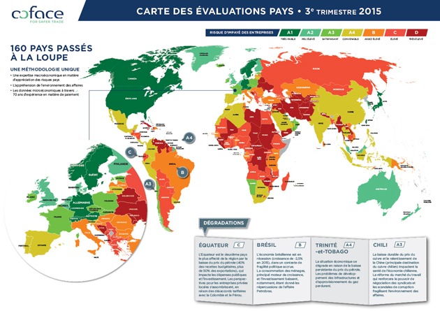premiers effets positifs de la transition politique.Amérique latine : les évaluations de quatre pays abaissées d'un cran L'Amérique latine (prévision d'une récession de -0,2% en 2015) subit une nouvelle vague de révisions d'évaluations à la baisse. - Le Brésil, mis sous surveillance négative par Coface en mars