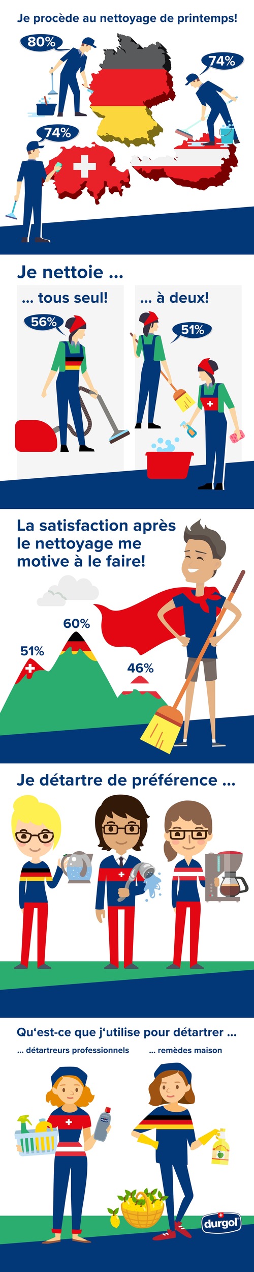 Pour de nombreuses personnes, l'arrivée du printemps est un bon moment pour nettoyer à fond son logement. Une étude effectuée par durgol, le leader du marché des détartrants en Suisse et en Autriche, offre une meilleure compréhension des habitudes de nettoyage des Suisses, des Allemands et des Autrichiens en livrant des résultats surprenants.