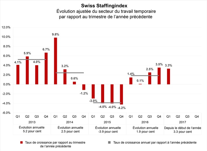 Communiqué de presseNouveau baromètre pour la branche: le secteur temporaire en progression de 1,9 % en 20162017-05-30T14:37:39Dübendorf (ots) - Les entreprises suisses de travail temporaire ont placé 1,9 % d'heures de travail supplémentaires en 2016. C'est ce qu'indique le nouveau Swiss Staffingindex lancé par l'association des services suisses de l'emploi swissstaffing. Il recense les chiffres commerciaux d'environ 200 entreprises suisses de travail temporaire. Avec 3,3 % d'heures de travail supplémentaires au premier trimestre 2017, le Swiss Staffingindex révèle une nouvelle accélération de l'économie suisse. Suppression du taux plancher maîtrisée Le secteur du temporaire est au coeur de l'économie suisse. Les entreprises de travail temporaire fournissent de la main-d'oeuvre à court terme à tous les secteurs économiques. Georg Staub, président de swissstaffing, le sait par expérience: «Un besoin en personnel accru et un carnet de commandes bien rempli se reflètent immédiatement dans les chiffres commerciaux des services de l'emploi.» Le Swiss Staffingindex l'illustre d'ailleurs de manière évidente. La suppression du taux plancher du franc suisse a lourdement grevé le secteur du travail temporaire. Les heures de travail fournies ont baissé de presque 4 % en 2015. Elles constituent pourtant la monnaie de la branche. Depuis le milieu de l'année 2016, la tendance est à nouveau à la croissance. Au cours des trois derniers trimestres, la branche a progressé de nettement plus de 2 % comparé à l'année précédente. 200 entreprises de travail temporaire, 40 % de parts de marché, un indice Le nouveau Swiss Staffingindex regroupe les heures de travail de près de 200 entreprises suisses locataires de services dans un indice destiné au marché du travail temporaire. Parmi ces entreprises comptent les grands noms du secteur comme Adecco Ressources Humaines SA, Manpower SA, Randstad Suisse SA, Kelly Services Suisse SA, Interiman Group Holding SA, dasteam ag ou Bellini Personal AG. Avec 66 millions d'heures de travail effectuées, le nouvel indice couvre 40 % du marché suisse du travail temporaire, notamment grâce aux nombreuses données provenant de petites PMU, en parallèle des grandes entreprises. Grâce aux solutions logicielles innovantes de Ralisator, M&D Solutions, Softside et btv-data, les grandes et petites entreprises de travail temporaire en Suisse peuvent définir de manière rapide et simple le salaire minimum correct et les assurances sociales adéquates pour les travailleurs temporaires. Ceci inspire un sentiment de sécurité aux travailleurs temporaires et aux entreprises, et le transfert de données automatisé procuré par des fournisseurs de logiciels à une instance neutre a donné naissance au Swiss Staffingindex. Celui-ci livre des données fiables au niveau maximal de qualité. Perspectives optimistes «La progression de 3,3 % lors du premier trimestre nous rend optimistes quant à l'évolution du secteur du travail temporaire en 2017», rapporte Marius Osterfeld, économiste chez swissstaffing. «L'économie continue de gagner du terrain. Chez swissstaffing, nous observons avec inquiétude les efforts grandissants de réguler le marché du travail suisse flexible. La croissance encore fragile serait très facilement étouffée par un monstre administratif tel que l'obligation d'annonce des postes vacants, tout comme la mise en oeuvre des nombreuses idées de régulation des syndicats.» L'évolution future du secteur du travail temporaire et de l'ensemble de l'économie se montrera tous les trimestres avec le Swiss Staffingindex. Informations complémentaires: Sur la page suivante, vous trouverez les principales données de l'indice et la comparaison du nouveau Swiss Staffingindex avec le KOF Indicateur de la situation des affaires. D'autres statistiques sont disponibles en cliquant sur ce lien http://ots.ch/VBhkv. Principales données concernant le Swiss Staffingindex Entreprises de travail temporaire prises en compte 200 entreprises Heures de travail saisies par an 66 millions Couverture du marché 40 % Rythme de publication trimestriel Collecte de données mensuelle Prochaine date provisoire de publication 27 juillet 2017 Source: swissstaffing, T1/2017. swissstaffing est le centre de compétence et de service pour les entreprises suisses de location de services. En tant qu'association des employeurs, swissstaffing défend les intérêts de plus de 370 membres auprès de tous les acteurs politiques, économiques et sociaux. swissstaffing est partenaire social de la CCT Location de services, le contrat incluant le plus d'employés de Suisse. Étude relative à la situation des travailleurs temporaires en Suisse: À la demande de swissstaffing, l'institut d'étude des marchés gfs-Zürich procède à des sondages réguliers. Vous trouverez l'étude actuelle en cliquant sur ce lien http://ots.ch/rQw8s. Contact: Marius Osterfeld, économiste / Tél.: 044 388 95 40 / 079 930 45 25, Permalink: