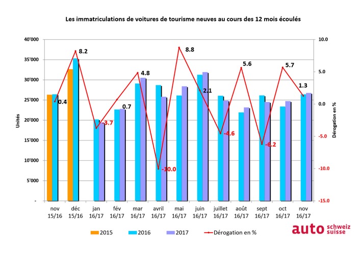 La progression de 1,3 % est effectif, compte tenu du fait que le mois de novembre écoulé comprenait le même nombre de jours ouvrables qu'il y a une année. Cette évolution positive de l'avant-dernier mois de l'année contribue à un résultat cumulé dans le vert. Jusqu'à présent, on a enregistré 282 956 nouvelles immatriculations en 2017, soit 963 de plus qu'au même moment en 2016. La hausse cumulée de 0,3 % est conforme aux pronostics d'auto-suisse, qui table sur un résultat de fin d'année similaire à celui de l'excellente année précédente, où 317 318 voitures neuves ont été immatriculées au total.