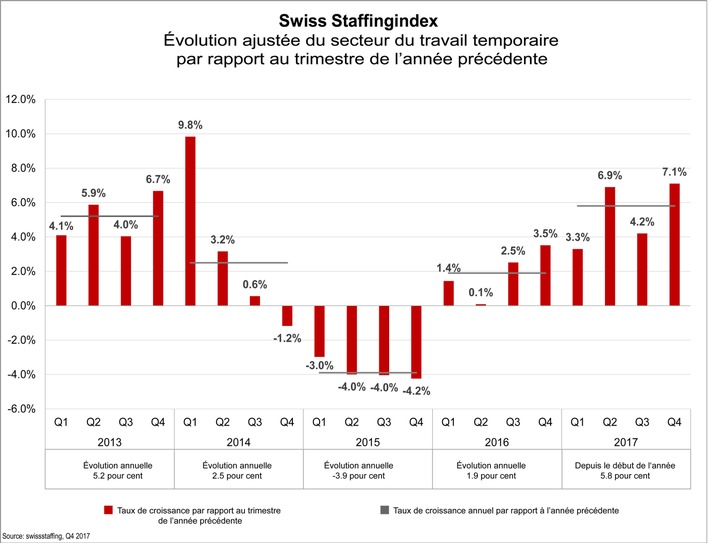 Communiqué de presseSwiss Staffingindex - Le travail temporaire, un moteur d'emploi à l'origine de 5 000 nouveaux postes2018-01-30T09:51:32Dübendorf (ots) - En 2017, le travail temporaire a permis de créer plus de 5 000 emplois en Suisse. Par rapport à l'année précédente, le nombre d'heures travaillées a augmenté de 5,8 %. Après deux années de crise, le secteur envoie ainsi un signal positif de développement économique global: au début de toute phase de croissance, les entreprises ont par expérience recours à des travailleurs temporaires afin de gérer la hausse de leurs commandes. Une croissance solide est donc attendue en Suisse en 2018. L'augmentation du chiffre d'affaires dissimule la baisse des marges Pour les nombreuses PME du secteur du travail temporaire, cette hausse significative du chiffre d'affaires arrive à point nommé alors que la pression soutenue de la concurrence et des clients toujours plus attentifs aux prix entraînent un recul des marges. Réaliser des bénéfices est néanmoins nécessaire pour supporter les coûts administratifs occasionnés par la mise en oeuvre de l'initiative sur l'immigration massive et pour relever les défis liés à la transformation numérique. Une croissance à risque Ces chiffres positifs s'accompagnent également de risques: la hausse du taux de vacance des logements locatifs, de même que la baisse de l'immigration pourraient conduire à une surchauffe conjoncturelle dans le domaine de la construction, un secteur clé pour les entreprises de travail temporaire. Des mesures de restriction du travail temporaire menacent par ailleurs de détruire directement d'importants emplois permettant un premier accès au marché du travail. Malgré tout, l'évolution favorable de l'économie mondiale et la croissance prometteuse en Suisse permettent au secteur du travail temporaire de tabler sur une année 2018 fructueuse. Marius Osterfeld, économiste chez swissstaffing, estime que «si le lien historique qui existe entre la croissance du PIB et le Swiss Staffingindex se confirme, la branche pourrait enregistrer en 2018 une nouvelle croissance proche de 5,8 %». D'autres statistiques sont disponibles via ce lien: http://ots.ch/Dfvgt Contact: Marius Osterfeld, économiste Permalink:
