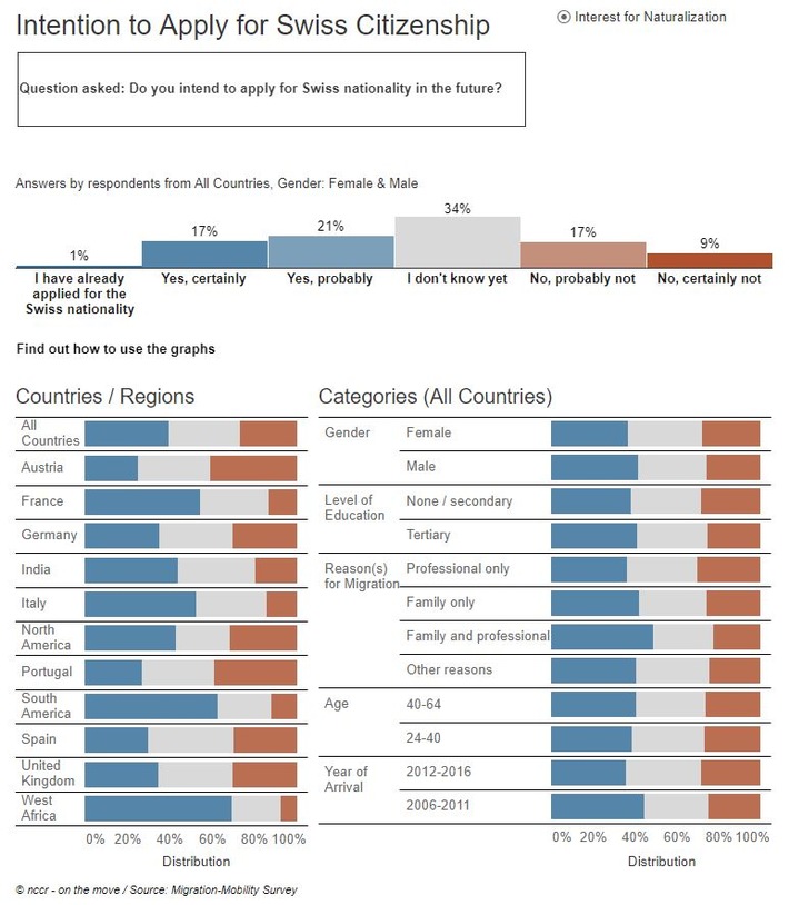 L'accès à la citoyenneté est par exemple un thème politique vivement débattu. La plateforme permet d'accéder rapidement et simplement à des informations validées scientifiquement, par le biais de visualisations attractives et interactives. Les résultats de l'enquête montrent ainsi que ni une installation définitive en Suisse, ni la naturalisation ne sont des buts ultimes pour la majorité des migrant·e·s. La plateforme interactive permet en outre de détailler ces résultats selon l'origine, le genre ou encore le niveau de formation des personnes interrogées. Ainsi, si plus de deux-tiers des migrant·e·s d'Afrique de l'Ouest ou d'Amérique du Sud souhaitent devenir Suisses, ce taux n'est que d'un quart pour les personnes d'Autriche ou du Portugal.