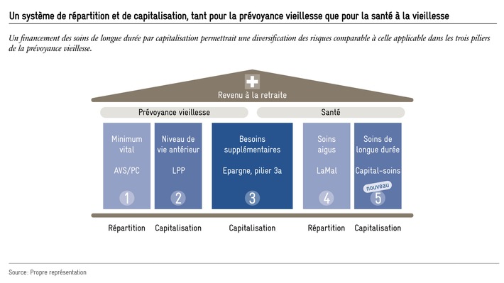 Un système à cinq piliers pour prendre en compte les soins de longue durée Si la prévoyance vieillesse suisse est si performante, c'est aussi parce que les différents piliers sont financés différemment : l'AVS par un système de répartition, la prévoyance professionnelle ainsi que l'épargne personnelle par un système de capitalisation. Il faudrait s'inspirer de cette expérience positive pour financer les coûts de la santé du quatrième âge. Les coûts croissants des soins de longue durée sont aujourd'hui supportés en premier lieu par l'assurance-maladie et de plus en plus par la collectivité. Ce problème va s'aggraver avec l'évolution démographique. Il faut ici une nouvelle solution qui mise davantage sur la prévoyance privée. Comme pour la prévoyance vieillesse aujourd'hui, il faudrait opter pour un financement qui repose sur un système de capitalisation. Les coûts des soins aigus (par exemple les traitements en cabinet médical ou à l'hôpital) seraient pris en charge par l'assurance-maladie, comme c'est le cas actuellement. Dans le cadre d'un système de prévoyance vieillesse plus global, il s'agirait du quatrième pilier. Les soins de longue durée, en revanche, seraient couverts par un cinquième pilier, organisé de manière similaire à la prévoyance professionnelle (voir figure). Les individus constitueraient ainsi un capital-soins individuel, transmissible par héritage. Le système de prévoyance suisse se transformerait en un modèle à cinq piliers. La publication est disponible en ligne sur notre site web Lien vers le fichier PDF de la publication Contact: Jérôme Cosandey (+41 79 828 27 87 ; jerome.cosandey@avenir-suisse.ch), Diego Taboada (+41 78 878 73 99 ; diego.taboada@avenir-suisse.ch), Sonia Estevez (+41 21 612 66 13 ; sonia.estevez@avenir-suisse.ch). Permalink: