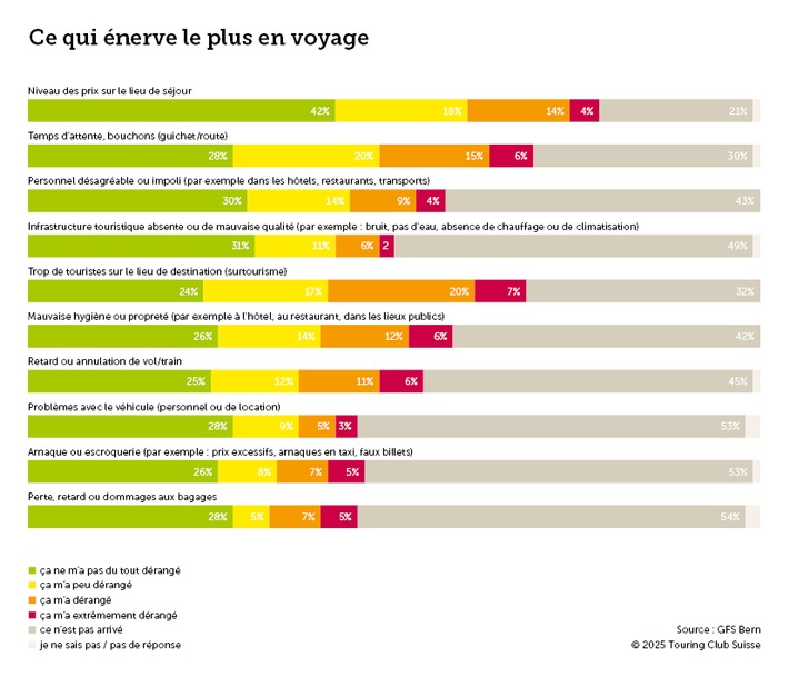 Bien que les voyages à l'étranger évoquent de nombreuses expériences positives, ils peuvent aussi être associés à des contrariétés. Pour ce neuvième baromètre, le TCS a pour la première fois demandé quels incidents pouvaient survenir. L'enquête auprès du grand public a révélé que le tourisme de masse (ou surtourisme) arrivait de loin en tête de liste. Les délais aux guichets ou sur la route ainsi que les prix élevés gênent également les Suisses et Suissesses en voyage. Pour les membres du TCS, le résultat est sensiblement le même, à cela près que le personnel désagréable est la cause d'irritation la plus fréquente.