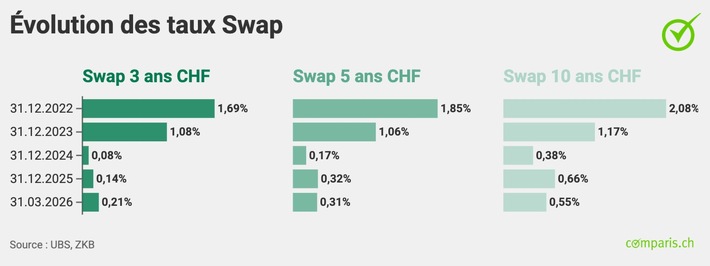 Communiqué de presseCommuniqué de presse : La guerre en Iran fait grimper les taux hypothécaires2026-04-14T00:30:19Communiqué de presse Baromètre des Hypothèques Comparis pour le premier trimestre 2026 La guerre en Iran fait grimper les taux hypothécaires En Suisse, les taux hypothécaires subissent à nouveau des pressions à la hausse, alors même que le taux directeur de la Banque nationale suisse (BNS) reste inchangé. Les principaux facteurs à l’origine de cette situation sont l’augmentation des risques géopolitiques, qui fait grimper les anticipations d’inflation et entraîne une hausse des taux du marché des capitaux. Parallèlement, pour de nombreux preneurs d’hypothèques, les coûts deviennent une préoccupation majeure, ce qui se traduit par une demande accrue pour les échéances courtes. « La proportion élevée d’hypothèques Saron montre que les coûts occupent clairement le devant de la scène », déclare Dirk Renkert, expert Argent Comparis. Zurich, le 14 avril 2026 – En mars, la Banque nationale suisse (BNS) a de nouveau maintenu son taux directeur à 0 %, confirmant ainsi son orientation en matière de politique monétaire. Malgré une légère hausse de l’inflation, le renchérissement de février, en augmentation de 0,1 % par rapport au même mois de l’année précédente, reste clairement dans la fourchette cible de 0 à 2 %. Dans le même temps, les conditions-cadres externes se sont assombries ces derniers temps. La guerre en Iran fait grimper les prix de l’énergie et renforce ainsi la pression inflationniste mondiale. « La BNS se trouve actuellement dans une situation délicate : à court terme, la pression inflationniste devrait augmenter en raison de la hausse des prix de l’énergie. En revanche, le renchérissement devrait rester modéré à moyen terme. Cette évolution plaide en faveur d’une poursuite de la politique de taux zéro », déclare Dirk Renkert, expert Argent Comparis. Les risques pour les prochains trimestres augmentent Dans l’ensemble, la conjoncture suisse est encore stable, même si elle présente les premiers signes de faiblesse. Pour 2026, on prévoit une croissance modérée d’environ 1 %, soutenue par la consommation des ménages et la hausse des salaires réels. Dans le même temps, la force du franc et la faiblesse de l’activité industrielle pèsent sur l’économie d’exportation. « Alors que le secteur des services affiche une évolution plus robuste, les incertitudes mondiales restent élevées et freinent la propension à investir. L’économie intérieure soutient la croissance, mais les secteurs tournés vers l’exportation continuent de pâtir du franc fort et de la situation mondiale incertaine », explique Dirk Renkert. Sur le plan international également, le tableau est contrasté : dans la zone euro, la Banque centrale européenne (BCE) a maintenu son taux directeur à 2 %. En février, l’inflation est proche de l’objectif, mais la hausse des prix de l’énergie accroît considérablement les risques pour les trimestres à venir. Parallèlement, les perspectives conjoncturelles se dégradent, en particulier en Allemagne, la première économie de la zone euro. La BCE se trouve ainsi de plus en plus dans une situation délicate, au carrefour de la lutte contre l’inflation et de la stabilisation de la conjoncture. « La BCE est davantage sollicitée que la BNS, car l’inflation dans la zone euro se situe déjà à l’extrémité supérieure de la marge de fluctuation cible. Si elle continue de s’accélérer en raison de la hausse des prix de l’énergie, il n’est pas exclu que les premières hausses de taux d’intérêt aient lieu cette année. Le franc pourrait se déprécier par rapport à l’euro et faire augmenter le coût des produits importés en Suisse », déclare D. Renkert. Aux États-Unis, la Réserve fédérale américaine (Fed) adopte également une attitude attentiste et maintient son taux directeur dans la fourchette de 3,5 à 3,75 %. Avec la forte hausse des prix de l’énergie, les risques d’inflation ont encore augmenté ces derniers temps. Parallèlement, les signes de ralentissement conjoncturel se multiplient, avec notamment un marché du travail moins dynamique et une baisse de la confiance des consommateurs. La Fed est donc confrontée à un arbitrage similaire en matière de politique monétaire. « Par rapport à la BNS et à la BCE, la Fed est probablement confrontée à la situation de départ la plus difficile en matière de lutte contre l’inflation. Avec 2,4 % en février, l’inflation est supérieure à la valeur cible d’environ 2 %. À cela s’ajoute l’incertitude quant à l’orientation future de la politique monétaire avec l’arrivée du nouveau président de la Fed en mai », explique D. Renkert. L’incertitude entraîne une hausse des taux du marché des capitaux ainsi qu’un élargissement des marges commerciales En Suisse, les taux hypothécaires ont de nouveau augmenté récemment, alors même que le taux directeur de la BNS reste inchangé. Le principal moteur de cette évolution n’est pas la politique monétaire, mais les mouvements sur les marchés des capitaux. Les taux d’intérêt du marché des capitaux ont d’abord baissé depuis le début de l’année, puis ont nettement augmenté après le déclenchement de la guerre contre l’Iran. Ainsi, le rendement des obligations fédérales à 10 ans s’élevait à 0,33 % en début d’année. Il a diminué pour s’établir à 0,23 % fin février, puis a augmenté pour atteindre 0,40 % fin mars. En revanche, les coûts de refinancement des banques, appelés « swaps », ont évolué différemment selon les échéances : les swaps sur dix ans sont passés de 0,66 % fin 2025 à 0,55 %. Au cours de la même période, les taux swap sur cinq ans n’ont que légèrement diminué, passant de 0,32 % à 0,31 %. En revanche, les taux swap sur trois ans sont pass