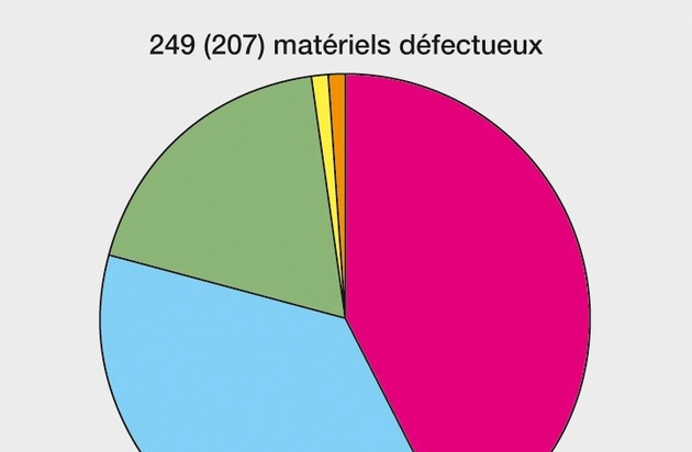 Au total, 249 matériels présentant des défauts ont été enregistrés. Ainsi, 15% de tous les matériels électrotechniques contrôlés présentaient des défauts. 106 d'entre eux comportaient des défauts de sécurité.