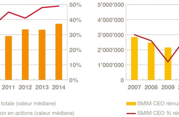 L'effet de levier de la fortune des CEO a également fortement augmenté : en 2008, un CEO d'entreprises du SMI et du SMIM possédait en moyenne des actions de sa propre société pour une valeur d'environ 1,6 fois - respectivement 1 fois - son salaire de base. En 2014 celles-ci représentent 7 fois - respectivement 4 fois - son salaire de base.