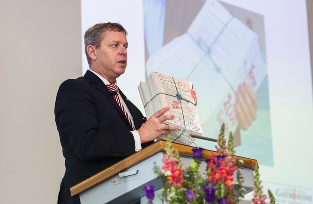Casimir Platzer, Präsident GastroSuisse, mit dem fast 2000 Seiten starken Verordnungspaket "Projekt Largo". Weiterer Text über ots und www.presseportal.ch/de/nr/100007695 / Die Verwendung dieses Bildes ist für redaktionelle Zwecke honorarfrei. Veröffentlichung bitte unter Quellenangabe: "obs/GastroSuisse
