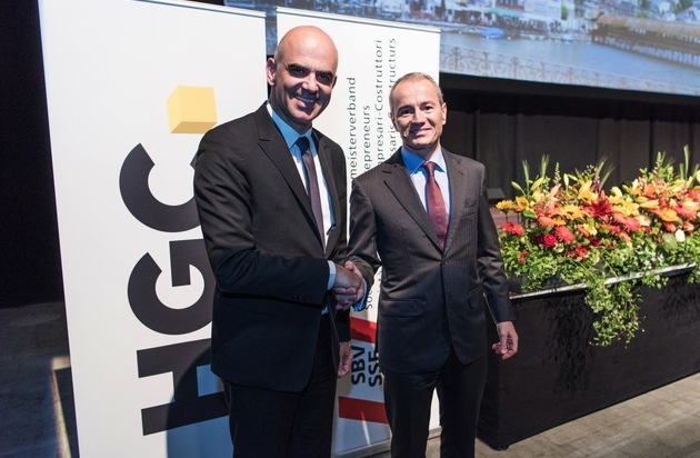 Le Conseiller fédéral Alain Berset et le président central de la SSE Gian-Luca Lardi lors de la journée de la construction 2016. L'utilisation de cette image est pour des buts redactionnels gratuite. Publication sous indication de source: "obs/SBV Schweiz. Baumeisterverband/Société Suisse des Entrepreneurs"