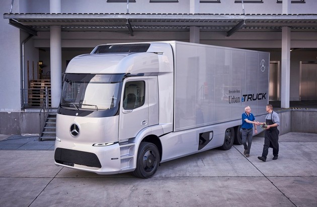 Mercedes-Benz urban eTruck, Exterior, silver arrow metallic, three-axle short-radius distribution truck, 2 x 125 kW, 2 x 500 Nm, 3 modules of lithium-ion batteries, total capacity: 212 kWh, electrically driven rear axle, operating range: up to 200 km, permissible gross vehicle weight: 26 t; Texte complémentaire par ots et sur www.presseportal.ch/fr/nr/100001544 / L'utilisation de cette image est pour des buts redactionnels gratuite. Publication sous indication de source: "obs/Mercedes-Benz Schweiz AG/Daimler AG"