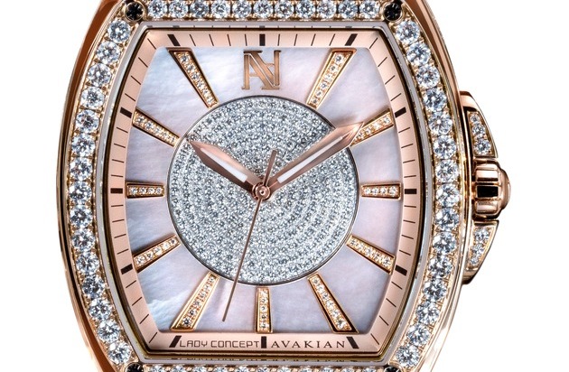 The Avakian Lady Concept jewelled timepiece features pink gold and diamond bezel, case and hour markers set with 564 diamonds. Uniting in beauty are the pink opaline, white diamond centre and pink mother-of-pearl dial. The watch has a pink gold deployant buckle clasp with a pearly-mosaic pink rubber strap. It is also available in alligator strap variation. Texte complémentaire par ots et sur www.presseportal.ch/fr/nr/100054124 / L'utilisation de cette image est pour des buts redactionnels gratuite. Publication sous indication de source: "obs/Avakian"