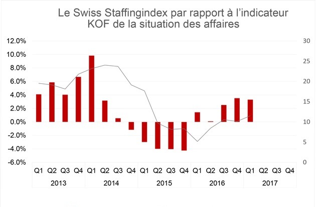 Le Swiss Staffingindex par rapport à l'indicateur KOF de la situation des affaires / Sources: swissstaffing, KOF, T1/2017 / Texte complémentaire par ots et sur www.presseportal.ch/fr/nr/100057910 / L'utilisation de cette image est pour des buts redactionnels gratuite. Publication sous indication de source: "obs/swissstaffing, KOF, T1/2017"