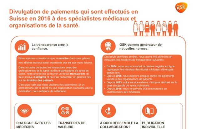 GSK est depuis des années un pionnier en matière de transparence et va au-delà des directives de la branche. Pour la deuxième fois, GSK divulgue sur son site Internet ses paiements à des spécialistes médicaux et organisations de santé. Ceci crée de la transparence pour les patients et renforce la confiance entre les méde-cins, les patients et les entreprises pharmaceutiques. GSK a résolument mis en oeuvre l'«EFPIA Disclosure Code», adopté par l'EFPIA (European Federation of Pharmaceutical Industries and Associations): ainsi, la stratégie «no consent - no contract» chez GSK a conduit à un taux de consentement réjouissant de 100% des médecins à une publication nominative.