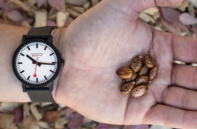 Mondaine essence watch and castor bean. Texte complémentaire par ots et sur www.presseportal.ch/fr/nr/100063327 / L'utilisation de cette image est pour des buts redactionnels gratuite. Publication sous indication de source: "obs/Mondaine Watch Ltd."