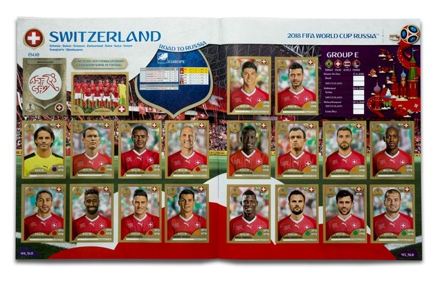 Double-page Suisse complète / Panini 2018 FIFA World Cup RussiaTM - Gold Edition / Texte complémentaire par ots et sur www.presseportal.ch/fr/nr/100020842 / L'utilisation de cette image est pour des buts redactionnels gratuite. Publication sous indication de source: "obs/PANINI SUISSE AG"