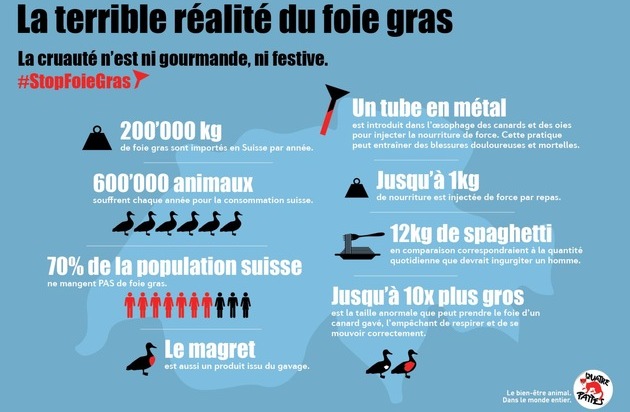 Selon Karin Hawelka, directrice des campagnes chez QUATRE PATTES Suisse, " le gavage des canards et des oies est une pratique cruelle connue par une majorité de la population suisse, mais malheureusement la consommation de ce produit continue à être élevée. Il est important pour nous de continuer à sensibiliser le public sur ce sujet afin que la demande de foie gras diminue ". De ce constat, la campagne se focalise sur les réalités brutales liées à la production du foie gras, notamment le fait que seuls les canetons mâles soient gavés et que les canetons femelles finissent broyés ou gazés peu après la naissance. Karin Hawelka : " La triste vérité est que les palmipèdes sont rendus obèses et ne peuvent plus ni respirer, ni se mouvoir correctement. La quantité de nourriture introduite de force dans leur oesophage jusqu'à trois fois par jour correspondrait à 12kg de spaghettis pour une personne.
