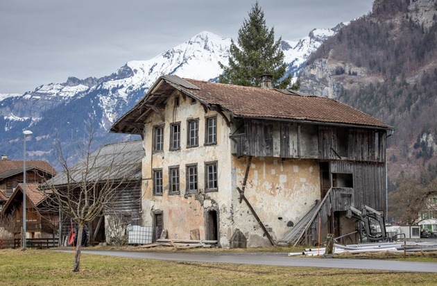 L'école d'Unterheid a été démontée pierre par pierre sur le site d'origine d'Unterheid près de Meiringen (BE). Pour les murs de pierre, on utilise du mortier de chaux produit sur place. / Texte complémentaire par ots et sur www.presseportal.ch/fr/nr/100072441 / L'utilisation de cette image à des fins éditoriales est autorisée et gratuite, pourvu que toutes les conditions d'utilisation soient respectées. La publication doit inclure le crédit de l'image.