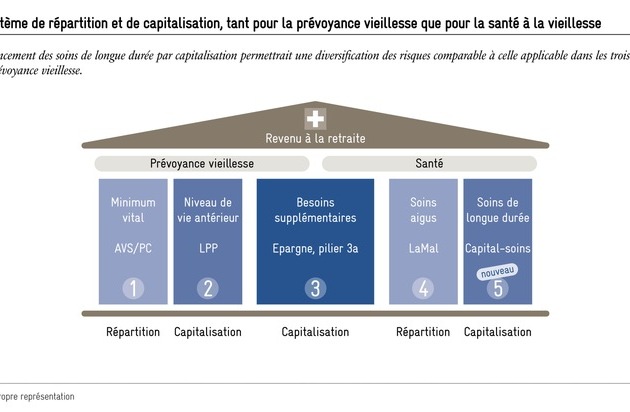Si la prévoyance vieillesse suisse est si performante, c'est aussi parce que les différents piliers sont financés différemment : l'AVS par un système de répartition, la prévoyance professionnelle ainsi que l'épargne personnelle par un système de capitalisation. Il faudrait s'inspirer de cette expérience positive pour financer les coûts de la santé du quatrième âge. Les coûts croissants des soins de longue durée sont aujourd'hui supportés en premier lieu par l'assurance-maladie et de plus en plus par la collectivité. Ce problème va s'aggraver avec l'évolution démographique. Il faut ici une nouvelle solution qui mise davantage sur la prévoyance privée.