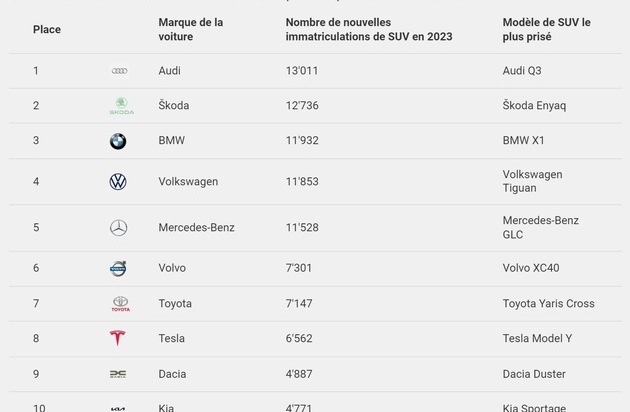Audi domine le classement des nouvelles immatriculations de SUV en 2023. Au total, le nombre de nouvelles immatriculations de la marque est de 13 011, l’Audi Q3 étant le modèle le plus prisé. Škoda et BMW suivent de près avec respectivement 12 736 et 11 932 nouvelles immatriculations de SUV. Historiquement, ce sont surtout les marques automobiles allemandes qui occupent les premières places du classement des SUV. Mais depuis 2019, le constructeur tchèque Škoda figure toujours dans le top 5, notamment grâce à ses modèles Enyaq et Karoq, très appréciés.
