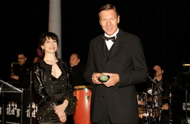 Nestlé Nespresso S.A., distingué pour les initiatives menées dans le cadre de son Programme AAA pour une Qualité Durable: Nespresso CEO Gerhard Berssenbrügge with actress Bebe Neuwirth and the "Corporate Green Globe Award" on May 16 in New York. Texte complementaire par ots. L'utlilisation de cette image est pour des buts redactionels gratuite. Imprimage sous indication: "obs/Nestlé Nespresso SA" food, award, environment
