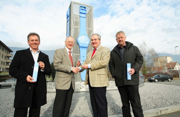 "Reto Stöckli, COO der Swatch AG, und Thomas Schweizer, Swatch Geschäftsführer Schweizer Markt sind stolz Grenchen, ihrem Stadtpräsidenten Boris Banga und ihrem Stadtbaumeister Claude Barbey ihr eben fertig gestelltes Swatch UNO Geschenk zu übergeben. / Reto Stöckli, COO de Swatch AG, et Thomas Schweizer, Directeur de Swatch Marché Suisse sont fiers de remettre leurs montres Swatch ONU à la Ville de Granges, à son Président, Boris Banga et à son directeur des travaux publiques, Claude Barbey. / Weiterer Text über OTS https://www.presseportal.ch/de/pm/100004013/swatch_ag . Die Verwendung dieses Bildes ist für redaktionelle Zwecke honorarfrei. Abdruck unter Quellenangabe: "obs/SWATCH" / Texte complementaire par OTS https://www.presseportal.ch/fr/pm/100004013/swatch_ag . L'utliisation de cette image est pour des buts rédactionels gratuite. Impression sous indication de source: "obs/SWATCH"