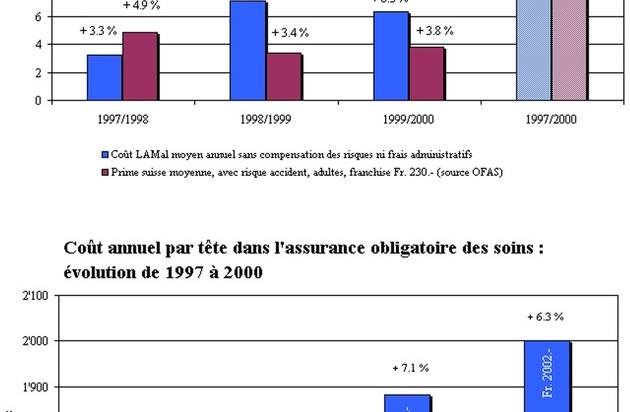 Prime et coût annuel par tête dans l''assurance obligatoire des soinst: variation annuelle de 1997 à 2000. Coût annuel par tête dans l''assurance obligatoire des soins: évolution de 1997 à 2000.