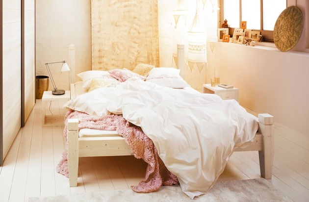 MERVEILLEUX BIEN-ÊTRE - tel est le mot-clé qui caractérise notre premier thème. Pour tous ceux pour qui ambiance chaleureuse, harmonie et matières naturelles ne sont pas un vain mot. Blanc et beige clair se lient tout en douceur à des touches de bleu pâle ou de vert tilleul. Ceux qui aiment se sentir proches de la terre se laisseront convaincre par CANTINA, un lit en sapin massif qui se distingue par des formes sans ambiguïté. Pour un sommeil plus près des étoiles, nous vous conseillons MARY-ANN, un lit à colonnes en pin ciré blanc. Deux modèles qui s'allient parfaitement avec des parures de lit en coton percale délicat dans des coloris naturel ou camel. Plaids en fourrure synthétique et coussins à mailles sauront parfaire votre confort; les lampes de table sculptées en filigrane apporteront les touches de lumière qu'il vous faut, tandis que de la salle de bains vous parviendra le doux parfum d'avocat de vos produits de soin pour le corps.