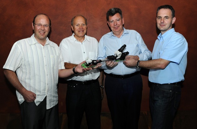 Conférence de presse V.Nordeck Int. Holding. de gàd: Christian Fritschi, Andreas Fritschi, Michael Sarp, (V.Nordeck), Stefan Ibach (CEO Fritschi) V.Nordeck International Holding AG reprend Fritschi AG Swiss Bindings, Conférence de presse du mardi 28 juillet 2009 à Zurich. Texte complémentaire par ots et sur www.presseportal.ch. L'utilisation de cette image est pour des buts redactionnels gratuite. Reproduction sous indication de source: "obs/v.Nordeck/PHOTOPRESS/Pius Koller"
