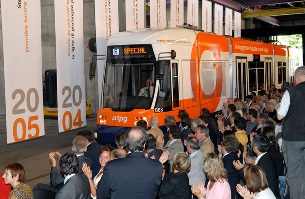 Les invités découvrent le tram porteur du nouveau logo / Forte progression de l'offre et résultats financiers positifs pour les TPG / Transports, Suisse, Conférence de Presse / Texte complémentaire par ots sous https://www.presseportal.ch/fr/. L''utilisation de cette image est pour des buts redactionnels gratuite. Reproduction sous indication de source: "obs/Transports Public Genevois"