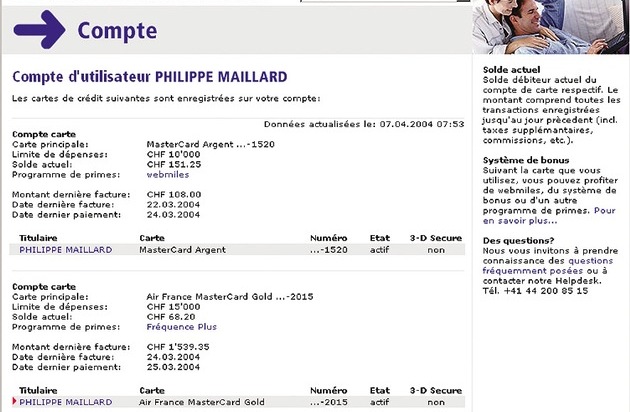 Depuis juillet 2003, Viseca Card Services SA propose à sa clientèle privée une nouvelle prestation gratuite en ligne: MyAccount. Celle-ci offre à tout moment et en tout lieu une vue d'ensemble sur les dépenses effectuées par carte de crédit ainsi qu'une transparence maximale en matière de taux de conversion et de frais de traitement.