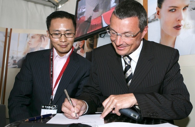 Chaoyong Wang, président du syndicat China Team du Qingdao International Yacht Club (gauche) et Jean-Christophe Babin, président-directeur général de TAG Heuer lors de lLa signature de contrat le 27 mai à Saint-Tropez . Texte complémentaire par ots. L'utilisation de cette image est pour des buts redactionnels gratuite. Reproduction sous indication de source: "obs/TAG HEUER"