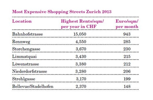 Most Expensive Shopping Streets Zurich 2013. Texte complémentaire par ots et sur www.presseportal.ch. L'utilisation de cette image est pour des buts redactionnels gratuite. Publication sous indication de source: "ots.photo/LOCATION GROUP".