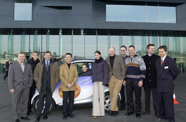 ET3102:LUCERNE,31JAN2002: FRANZ STEINEGGER ET MISS SUISSE 2000 DONNENT LE COUP DENVOI DU HUG CHARITY TOUR QUI PARCOURRA TOUTE LA SUISSE - Hug AG de Malters met son 125e anniversaire entièrement au service dun Charity Tour qui permettra aux enfants de conditions financières modestes de partir en vacances. Photo: les célèbres pilotes Hug de gauche à droite : le skieur Urs Kaelin, Raphaela Hoehn, le conseiller national Franz Steinegger, le champion olympique Donghua Li, au volant «Face of Switzerland» Jadi Simic, Miss Suisse 2000 Anita Buri, le skieur Peter Mueller, le chef détat-major des finances de Lucerne Christoph Nick, le bobeur Reto Goetschi, lanimateur sportif Rainer Salzgeber et Walter Fritschi (pro Juventute). ths/E.T. STUDHALTER/HUG AG
