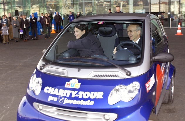Du 31.1.02 au 6.11.02, l'équipe HUG sillonnera le pays non pas au volant de ses voitures normales mais dans des Smart HUG spécialement décorées. 40 personnalités du monde du sport, de la politique, de l'économie et du showbiz se sont également déclarées prêtes à échanger leur voiture contre une Smart pendant une semaine. Ce relais constitue le fil rouge du CHARITY TOUR et souligne l'ambition caritative de cette action. Franz Steinegger et Anita Buri montrent l'exemple en ouvrant le prologue du tour.