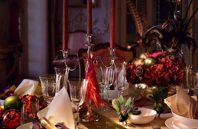 Le décor voluptueux semble sorti d'un tableau et les hôtes sont béats d'admiration: Rêvent-ils donc? - Si vous voulez bien prendre place à table... Des contrastes clairs/obscurs, avec des touches de rouge profond et de vert sapin, de vieil or et argent, font planer le mystère. Tissus brodés, vaisselle en porcelaine fine et beaux verres gravés ornent la table festive. Des figurines amusantes et nostalgiques mènent la danse; rameaux, glands et plumes rares s'entrecroisent pour parachever le style. Les bougies dans les candélabres précieux, les boules scintillantes et les guirlandes lumineuses créent une ambiance propre à Noel.