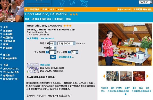 Sur demande, le Minotel AlaGare sert un copieux buffet petit déjeuner chinois dans sa magnifique salle à manger de type chalet suisse (à partir de 6 personnes). Mehr Information auf [ https://www.minotel.com/ch144 ]www.minotel.com/ch144. Texte complémenataire par ots. L'utilisation de cette image est pour des buts rédactionnels gratuite. Reproduction sous indication: "obs/Minotel".