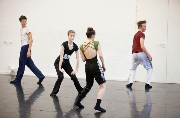 Quatre lauréats au moment de l'entraînement de danse contemporain (v.l.n.r.: Flavien Mingot, Fabienne Wäger, Sidney Turtschi, Till Brechbühl). Image: Miriam Elias