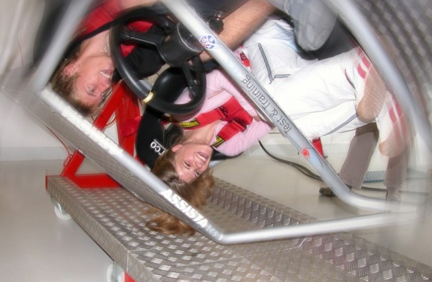 Elèves de la classe de Heiden en pleine action sur simulateur de tonneaux ! Texte complémentaire par ots. L''utilisation de cette image est pour des buts redactionnels gratuite. Reproduction sous indication de source: "ots/Renault".