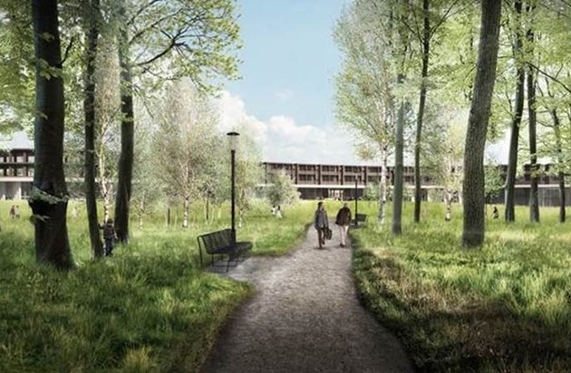 Photo du projet, vue des alentours, construction hospitalière d'Herzog & de Meuron au Danemark / Texte complémentaire par OTS et sur www.presseportal.ch/fr/pm/100055108 / L'utilisation de cette image est pour des buts redactionnels gratuite. Publication sous indication de source: "OTS.photo/Herzog & de Meuron"