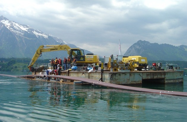 Travail de précision : pose des quatre tuyaux de protection sur le fond du lac de Thoune. Texte complémentaire par ots. L'utilisation de cette image est pour des buts redactionnels gratuite. Reproduction sous indication de source: "obs/ BKW FMB Energie AG "