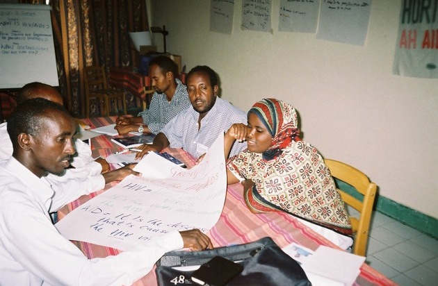 "Aids is the disease that's caused by HIV" : travail en groupe lors du workshop d'Hargeisa, Somalie. Texte complémentaire par ots. L'utilisation de cette image est pour des buts redactionnels gratuite. Reproduction sous indication de source: "ops/Aide Suisse contre le Sida"