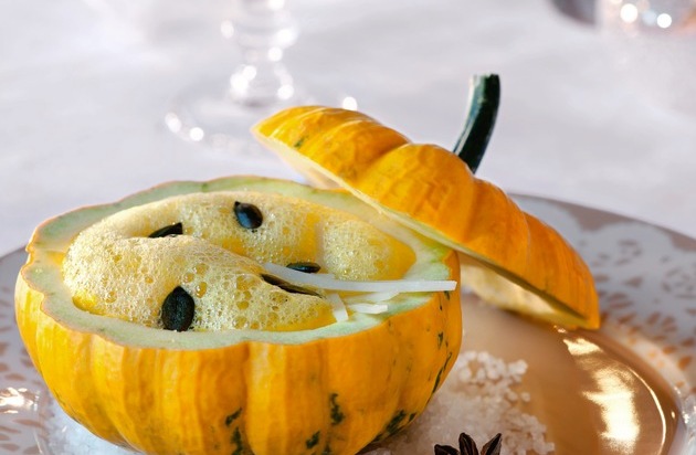 - Sablés aux oignons et au vieux Gruyère - Soupe crémeuse aux courges muscade avec copeaux de parmesan et graines de courge grillées - Risotto Nostrano du Tessin au curry de Madras et aux baies de goji servi avec des langoustines rôties - Médaillons de filet mignon de veau nappés d'une sauce à la crème, aux morilles et au vin jaune, légumes oubliés aux petits oignons blancs dans leur jus servis sur un lit de mousseline de pomme de terre. - Crème cuite aux oranges sanguines, sauce au chocolat et gaufrettes aux amandes