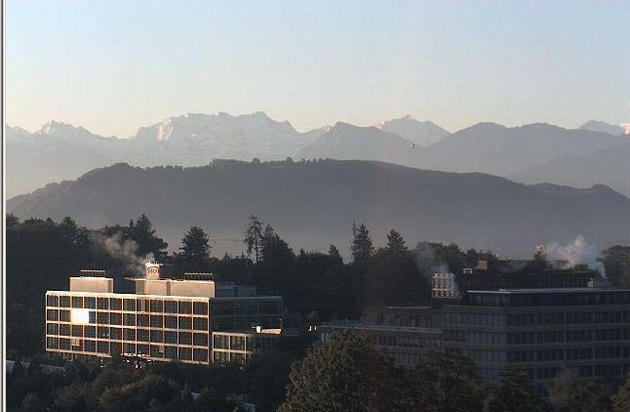 Le toit du bâtiment de sept étages qui abrite le siège de swissinfo dans le quartier bernois d'Ostring accueille désormais cinq webcams dirigées plein sud. Par beau temps, elles offrent une vue panoramique complète - et en direct - des Alpes bernoises: le Finsteraarhorn, le célèbre trio Eiger, Mönch et Jungfrau, les falaises de Schwalmeren, le Niesen, la Blüemlisalp et le Stockhorn. Au premier plan, on reconnaît les quartiers bernois de Murifeld et Wittikofen.