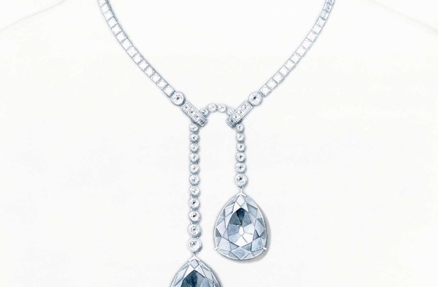 Les diamants Cartier Tiger tears. Paire de diamants de taille ancienne forme poire d'origine des mines de Golconde, pratiquement uniques au monde par leur poids, leur provenance et leur feu exceptionnel. Montées sur une ligne en platine et diamants. Texte complémentaire par ots. L'utilisation de cette image est pour des buts redactionnels gratuite. Reproduction sous indication de source: "obs/Cartier"