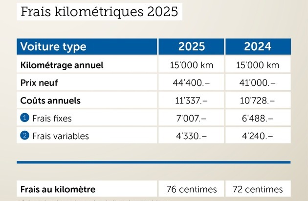 Avec les méthodes de calcul du TCS, c'est avant tout l'augmentation des coûts fixes qui saute aux yeux, avec un montant total de CHF 7'007 par an pour une voiture de tourisme type, contre CHF 6'488 l'an dernier. La progression des coûts variables (CHF 4'330 en 2025 contre CHF 4'240 l'an dernier) reste quant à elle marginale.