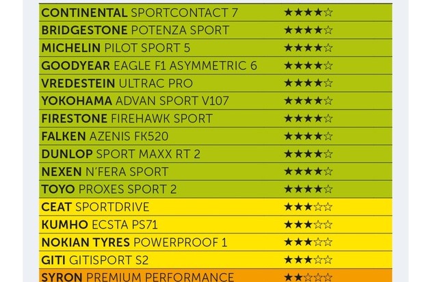 Les vainqueurs du test sortent des ateliers de production Continental, Bridgestone, Michelin, Goodyear, Vredestein, Yokohama, Firestone, Falken, Dunlop, Nexen et Toyo. Ainsi, 11 des 17 candidats testés obtiennent la mention " très recommandé ", conformément à la pondération 70 % sécurité de conduite et 30 % bilan environnemental. Au sein de ce top 11, deux modèles de pneus se distinguent particulièrement en matière de sécurité de conduite : le Continental SportContact 7 et le Bridgestone Potenza Sport obtiennent des résultats exceptionnels sur chaussée sèche grâce à une adhérence élevée, une précision exceptionnelle et une grande sécurité lors de manoeuvres difficiles. Leur adhérence est tout aussi élevée sur chaussée mouillée.